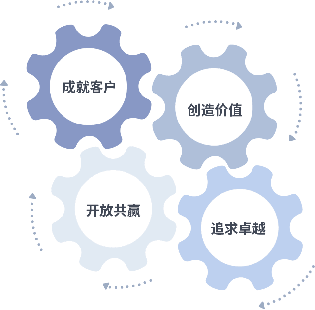 成就客户是一切决策的出发点,,创造价值是衡量所有工作的标准,,,,追求卓越是我们做事做人的态度,,开放共赢是我们的格局也是最终的结果。。。。价值观的齿轮环环相扣,,,推动着组织里的每个人不断向前。。