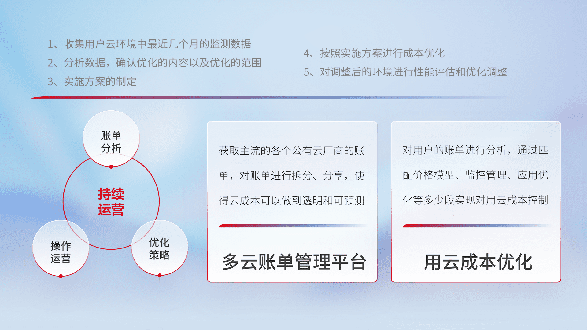 通过多云纳管,,以统一的资源数据模型把客户的云资源进行抽象和封装,,,,进而实现对多云资源的统一操作,,,保障云资源管理的可靠性、、、稳定性与可用性。。。。量身定制化运维内容,,配置、、开发运维、、补丁管理、、、、备份、、、、监控、、、、认证和访问管理、、、审计和日常巡检等,,,,保障在用云过程中的可靠度,,稳定度以及高可用率。。。。
